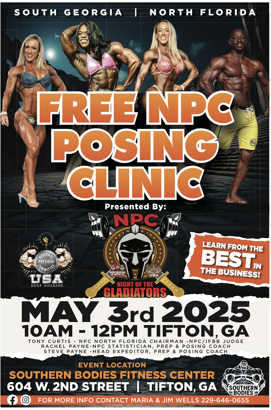 Prepare for success at the NPC Posing Clinic, a free event designed to help bodybuilders perfect their posing skills! This clinic is hosted in collaboration with the NPC Night of the Gladiators, South Georgia’s premier bodybuilding competition, and will take place at Southern Bodies Fitness Center.